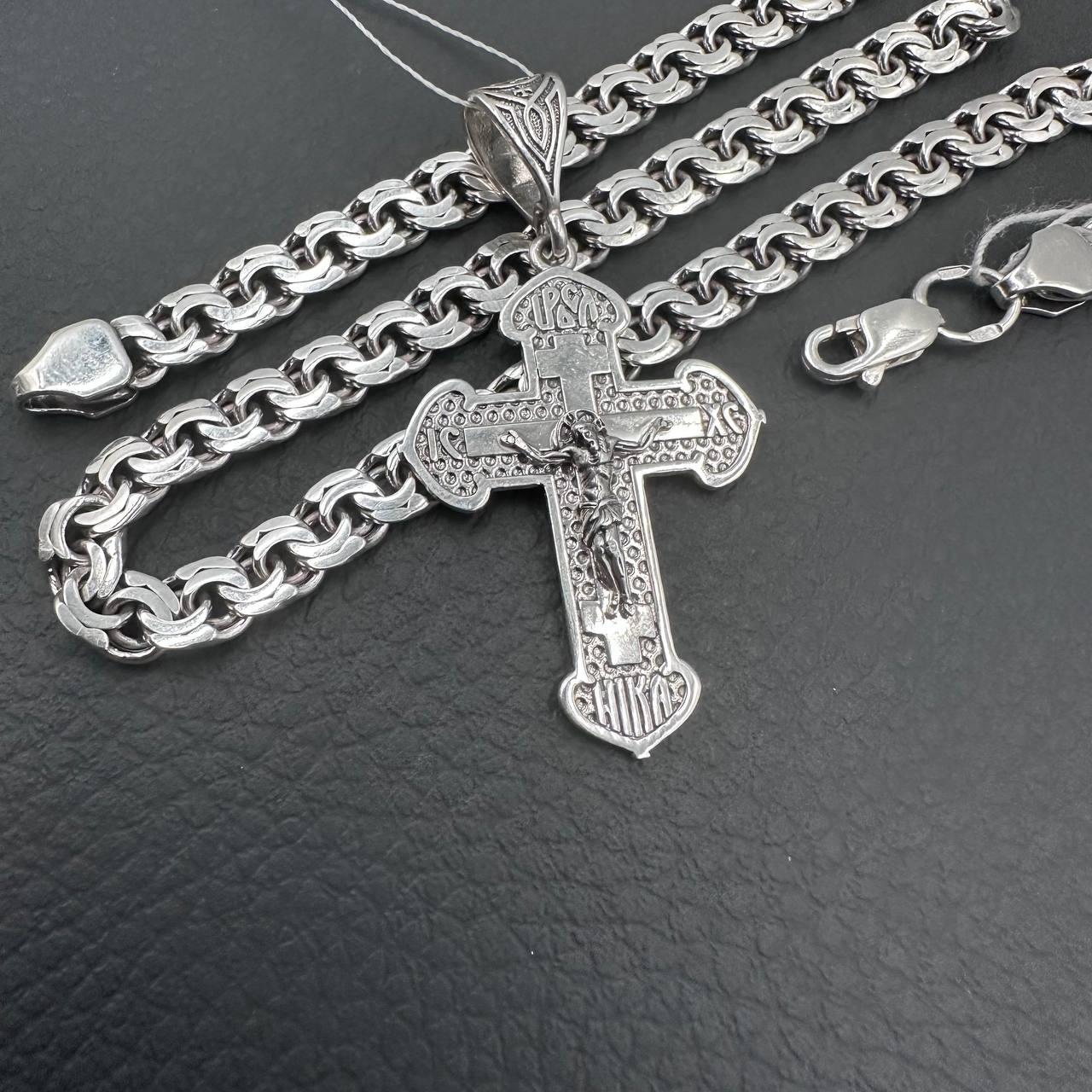 Срібний ланцюжок бісмарк йде в комплекті з хрестиком. На хресті зображено образ розп'ятого Ісуса, на звороті є напис «Спаси и сохрани». Розмір хрестика з вушком – 48мм*26 мм, вага – 5 г.