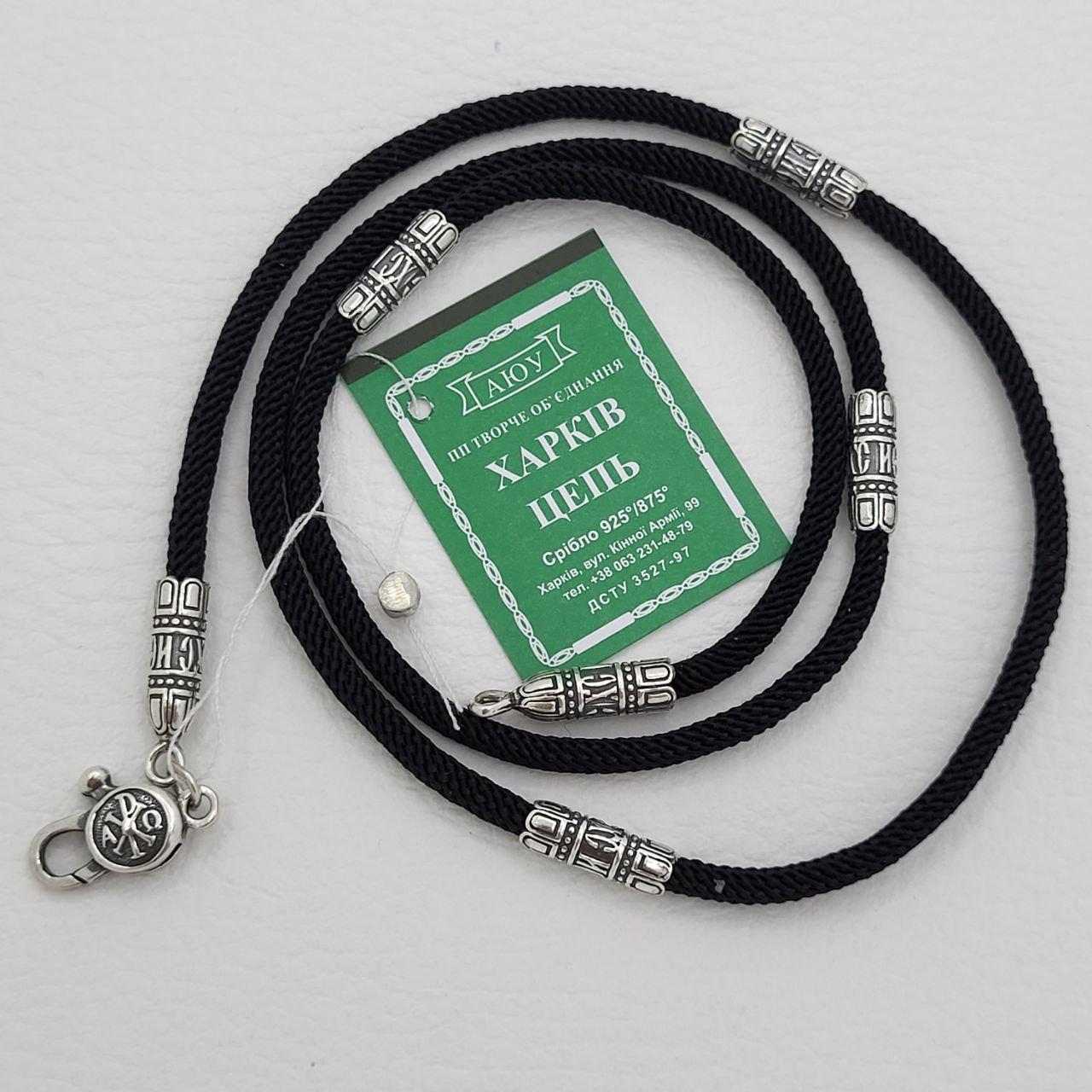 Ювелірний шовковий шнурок з срібними вставками і застібкою 925 проба